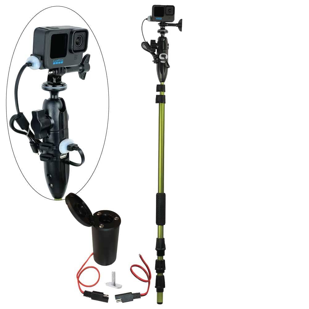 Once you mount the PowerStick into your navigation light port on the front or back of the boat, you mount the GoPro Hero 10, 9, 8, 7, 6, 5 4 3 or any GoPro, Tactacam, VIRB, DJI. Basically ANY action camera ever made on top of the ball and joint mount using a GoPro mount and screw or use the 1/4"-20 tripod thread. Next you plug in the USB cord into the PowerStick and into the action cam. We also have the best phone mount on the market to mount and power any cell phone for YouTube Live, Instagram Live, Facebook Live, etc. Everyone talks about how GoPro batteries die quickly and only last about an hour, but cell phone batteries do not last long while on the water looking for signal. Don't worry about your cell phone battery dying, get YOLOtek and power your cell phone all day long with constant power.