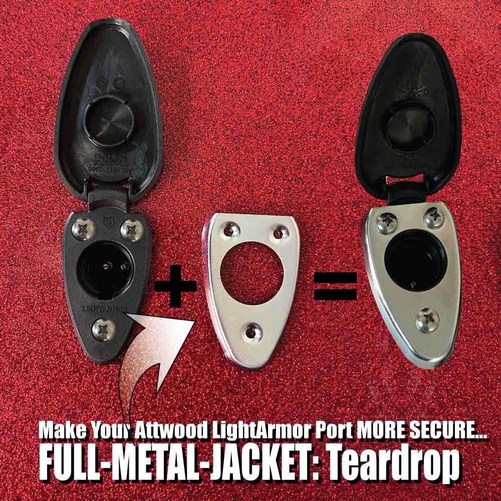 Have a boat with an Attwood LightArmor Teardrop port and want to make it even more secure? Get Full Metal Jacket for TEARDROP LightArmor Port. Will ONLY fit Attwood LightArmor Teardrop series navigation light port. Made of stainless steel and custom built to make your port very secure. We love Attwood, but the amount of plastic holding the port to the boat is very thin... capping the port with Full Metal Jacket will ensure your navlight or YOLOtek gear stay secure.