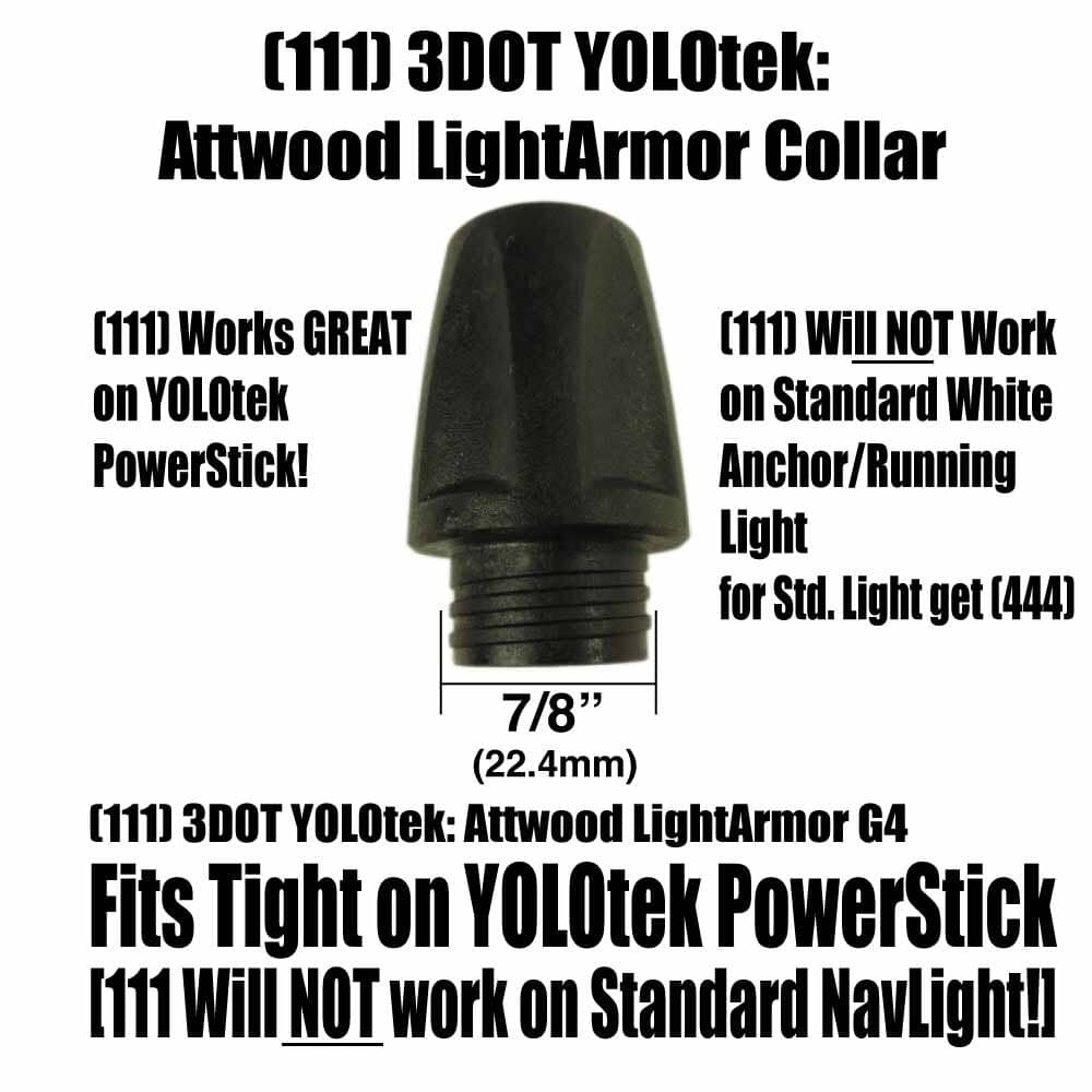 The NEW & IMPROVED (111) 3DOT Attwood LightArmor Treaded Collar has been rebuilt from the ground up. Over 50% stronger than the 444 Original Attwood Locking Collar. Fits good on YOLOtek PowerSticks, so if you need a replacement this is it.
