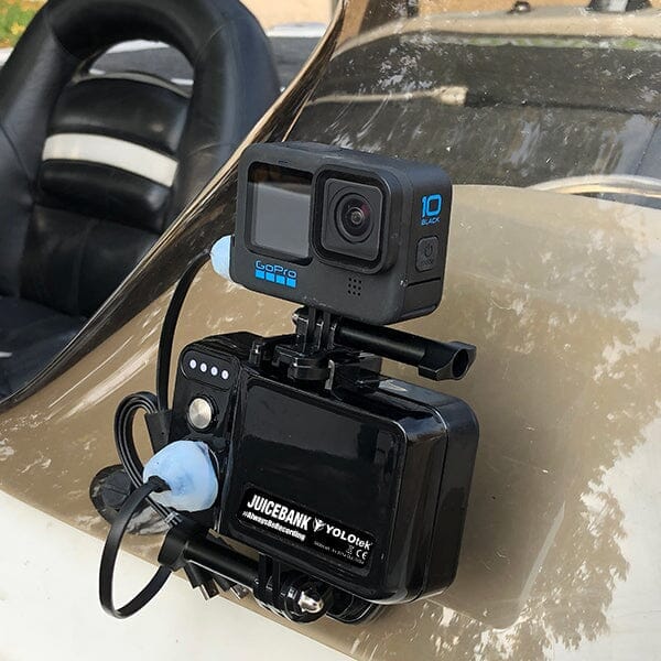 NOTE: We do not recommend motoring on top of The BOOM! seat post mount or on windscreen mounts, especially in rough water. NEVER attach to a windshield of a car or boat while traveling, as the weight of the camera can not be supported. Always tether JUICEBANK and the camera at all times. Be safe!