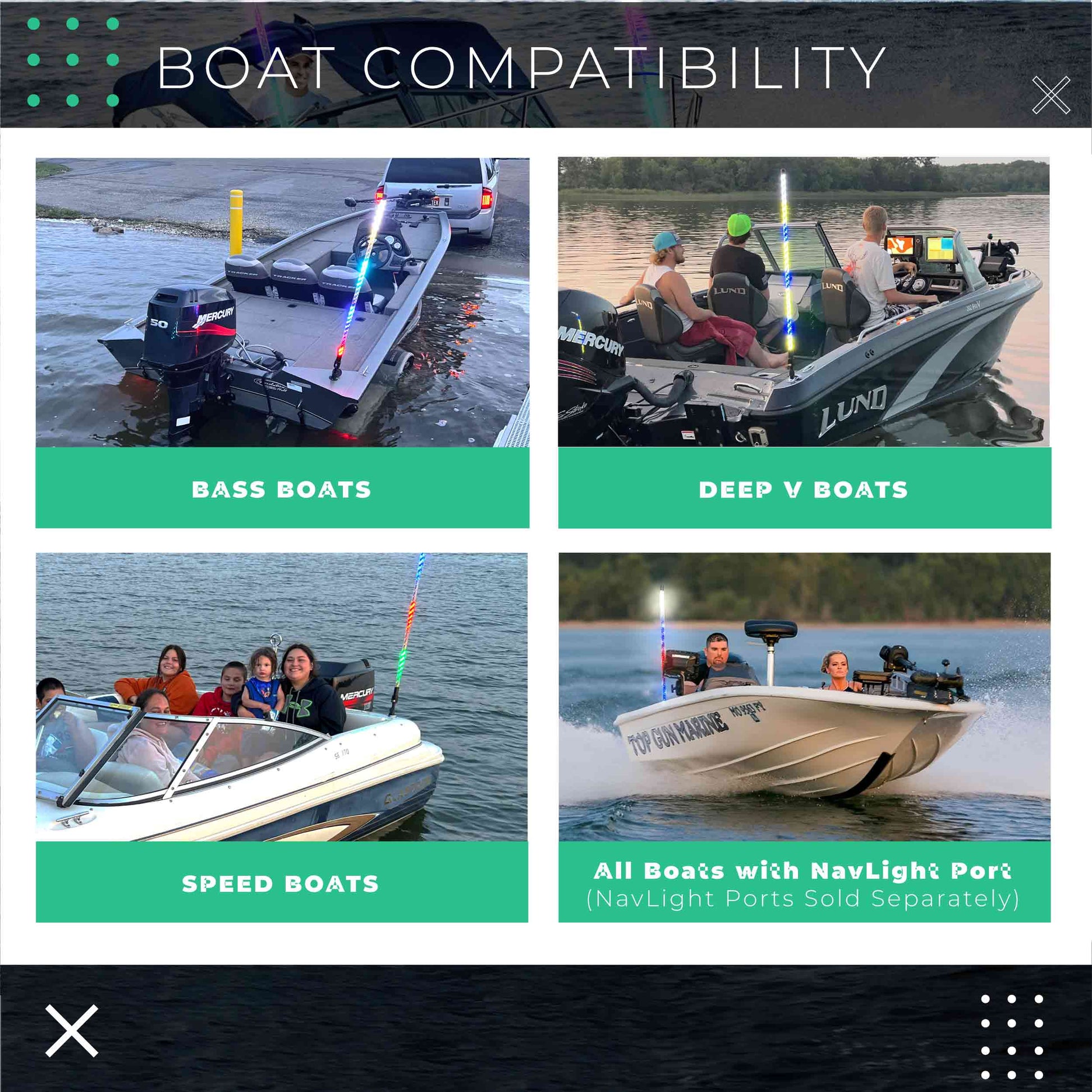 Perfect for ANY boat or kayak with a navlight port from Bass Boats, Deep V, Bay Boats, power boats and more. If your boat does NOT have a navlight port... No worries, just select the BUNDLE below that comes with a Flush Mount Port to put it on any jon boat or kayak. If your kayak has a track, then select the BUNDLE below that comes with a PowerTrack Mount.