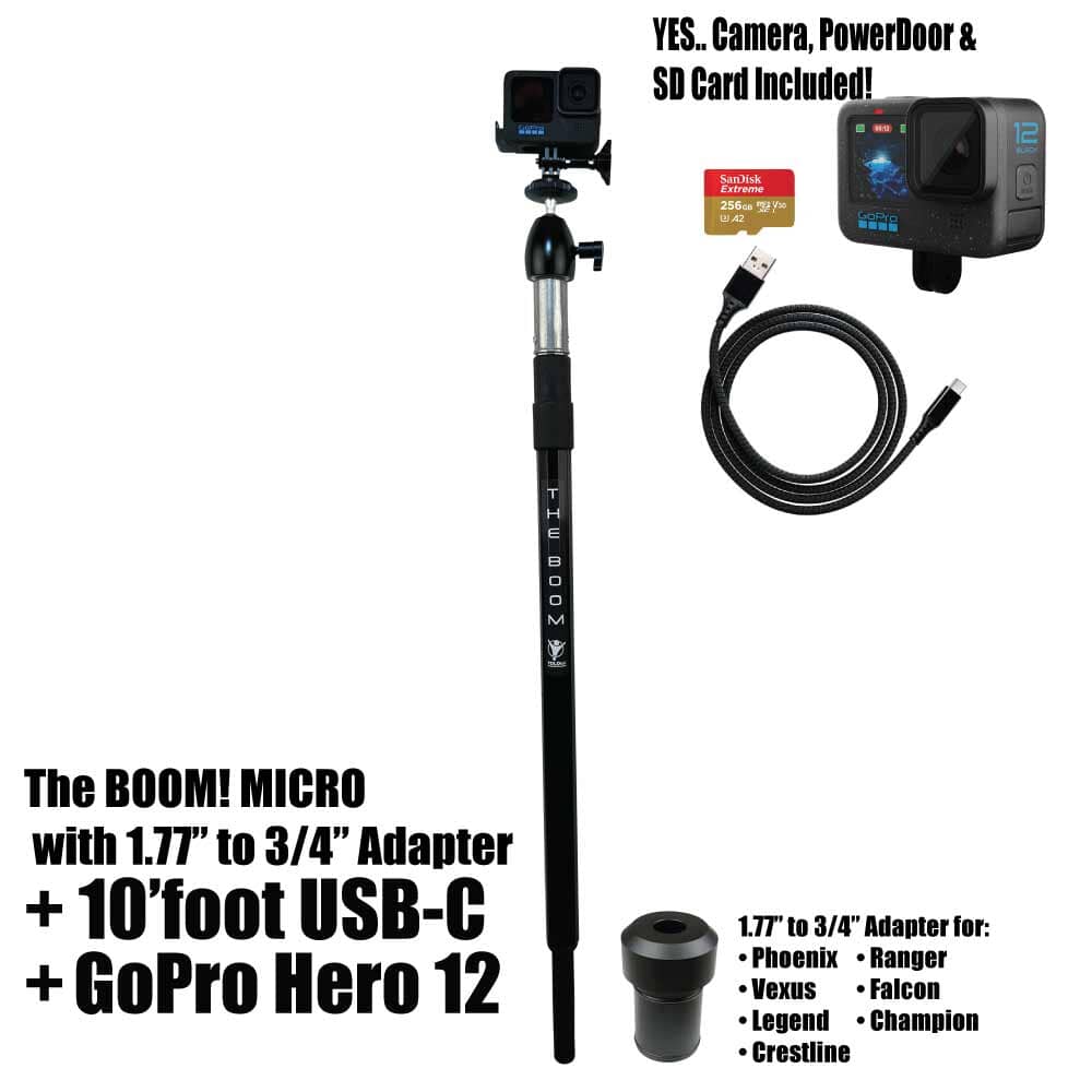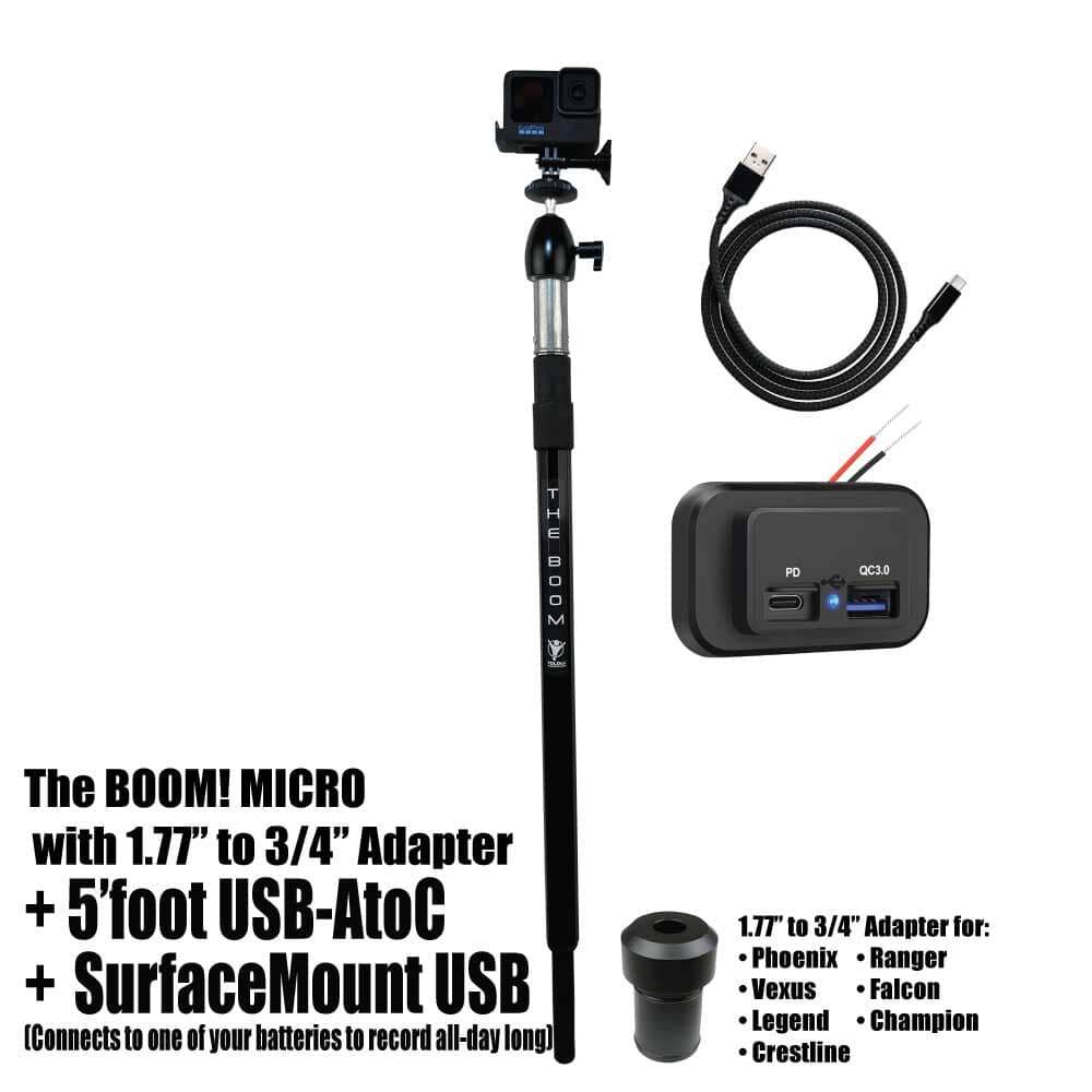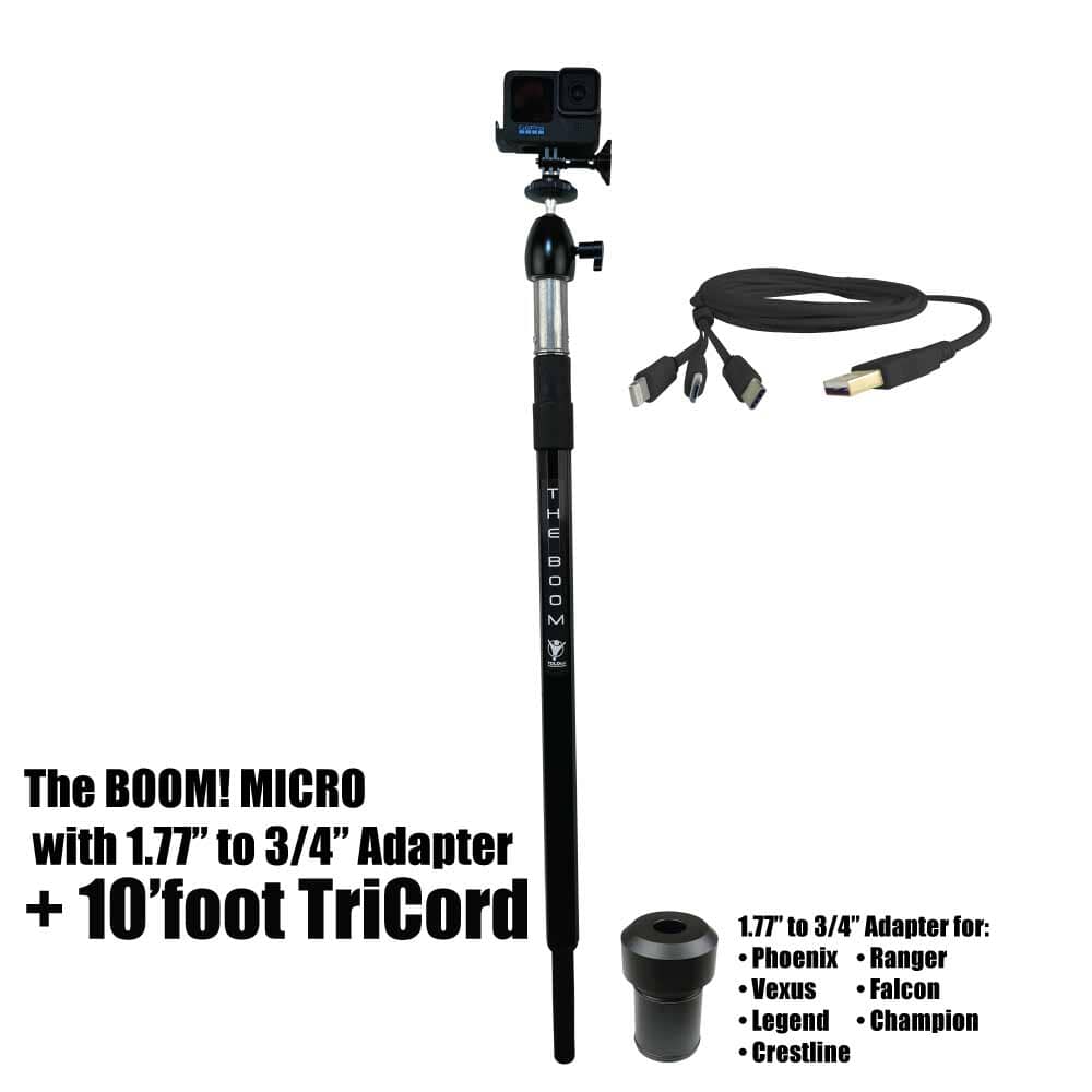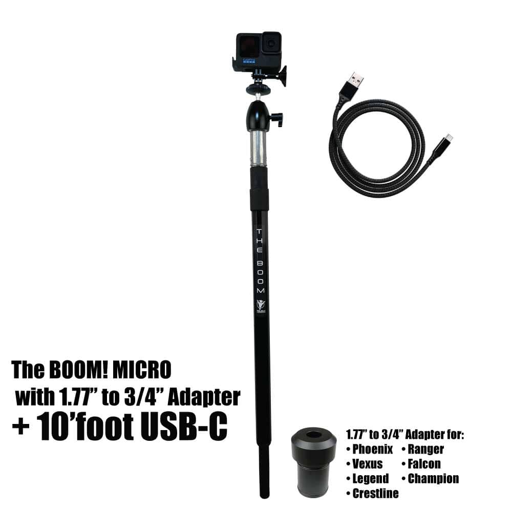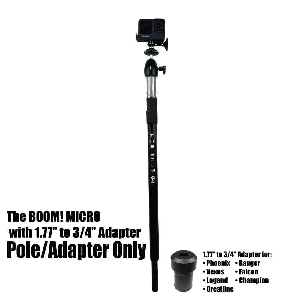THE BOOM! Micro is the epic action camera mount you have been waiting for to hold your GoPro, DJI, or any action camera. Secures into your 3/4" seat connector on your boat. Made of aircraft grade aluminum. Extremely strong. Extends from approx 26" to 36" to help you get those amazing shots. You won't believe it until you see it. You will love this epic mount.