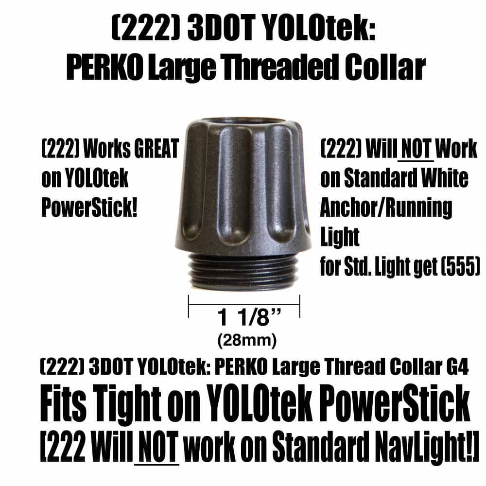 The NEW & IMPROVED (222) 3DOT Perko Large Threaded Collar has been rebuilt from the ground up. Over 50% stronger than the 555 PERKO Large Thread Collar.Fits good on YOLOtek PowerSticks, so if you need a replacement this is it.